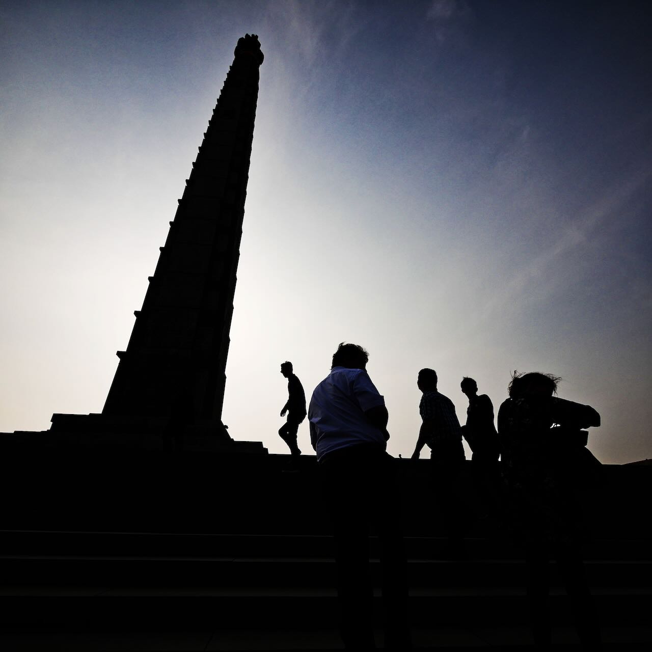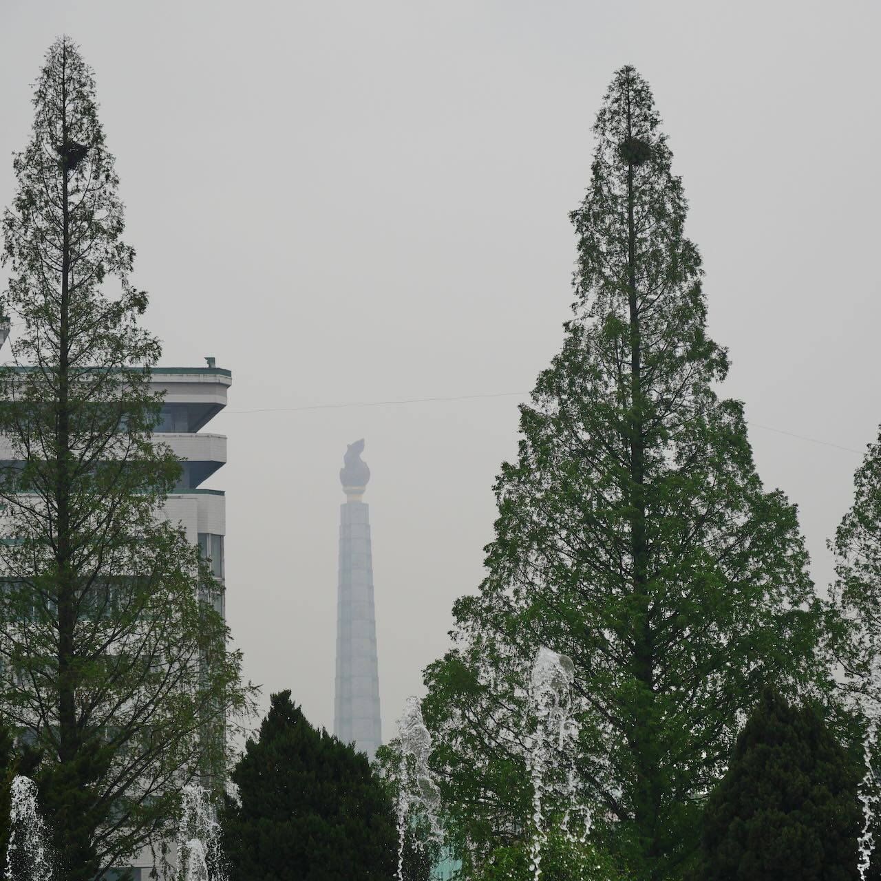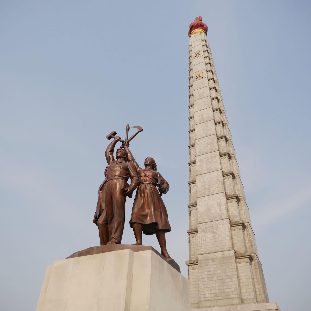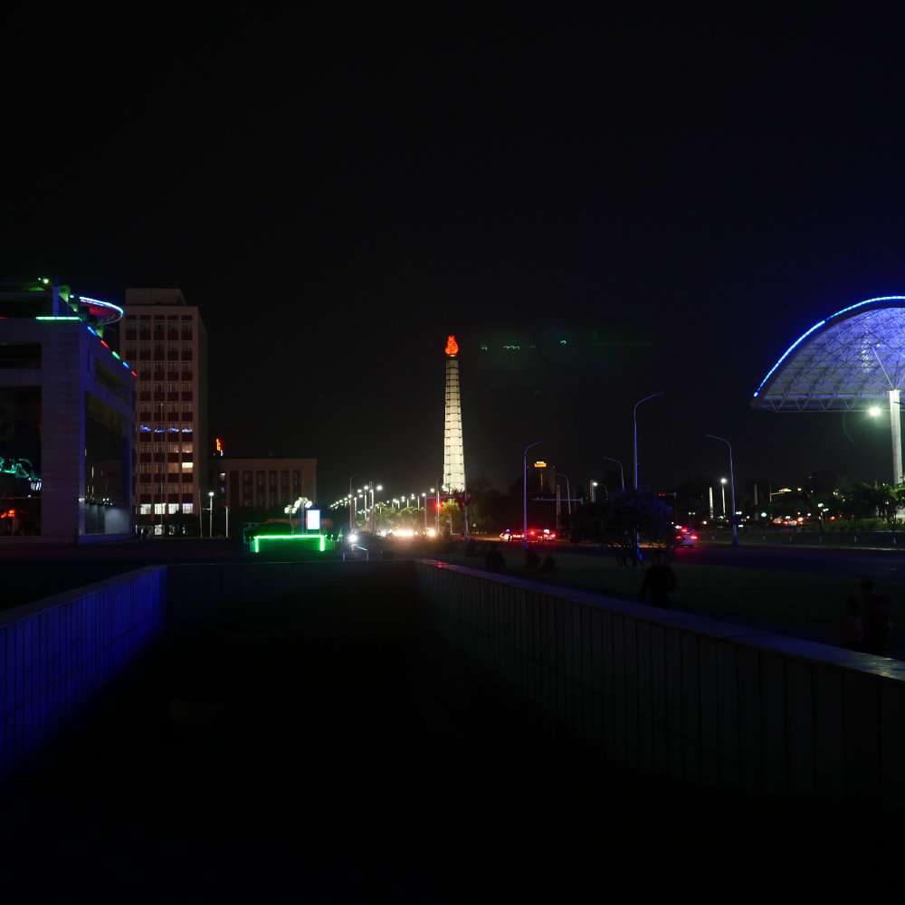 Der Juche Tower steht natürlich für diese Ideologie. Er besteht aus einer überdimensionalen Fackel, die in der Nacht erleuchtet ist. Ein Lift bringt einen bis hinauf zur Fackel. Leider waren wir aber inzwischen zu spät dran, so dass die Fahrt nach oben nicht mehr möglich war. Vor dem Monument findet sich wieder die Trilogie aus Hammer, Sichel und Pinsel – und guckt man in die eine Richtung, fallen die typischen Porträts auf:
