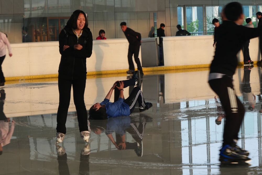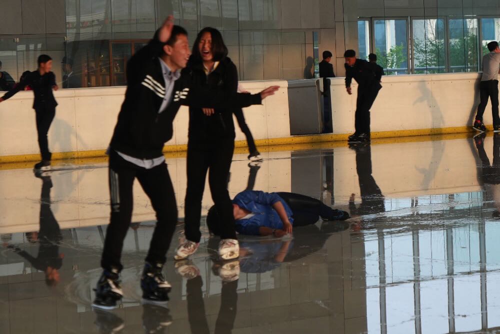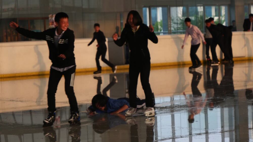 Das zeigt sich insbesondere auch im Eisstadion. Nordkorea ist ein armes Land, es kommt immer wieder zu Stromengpässen und offensichtlich gelingt es auch nicht, die Eisfläche genug zu kühlen. Die Nutzer scheinen zwar ein Gaudi zu haben, aber auch hier scheinen nur wenige Zugang zu haben – und wirklich geübt scheinen sie nicht zu sein.