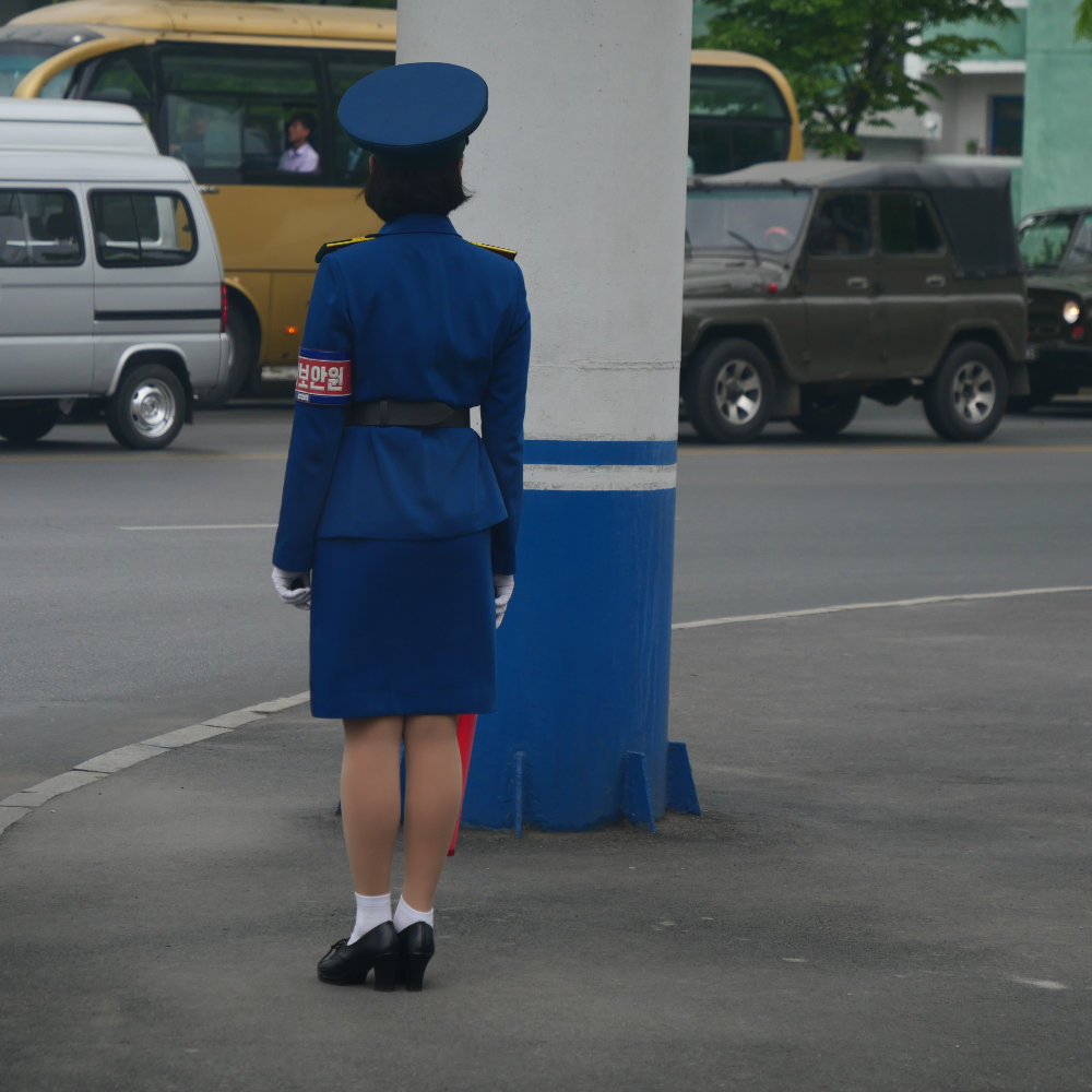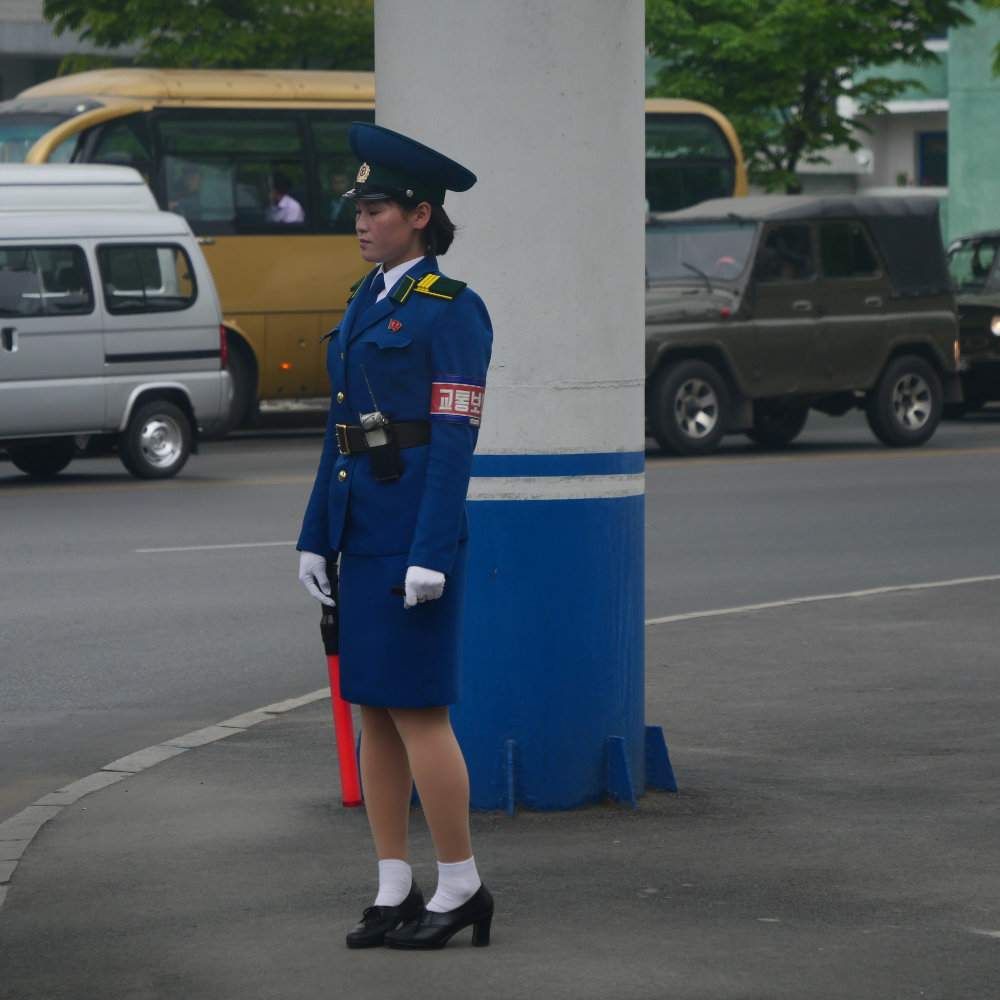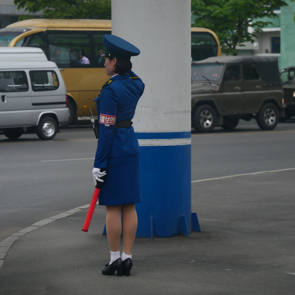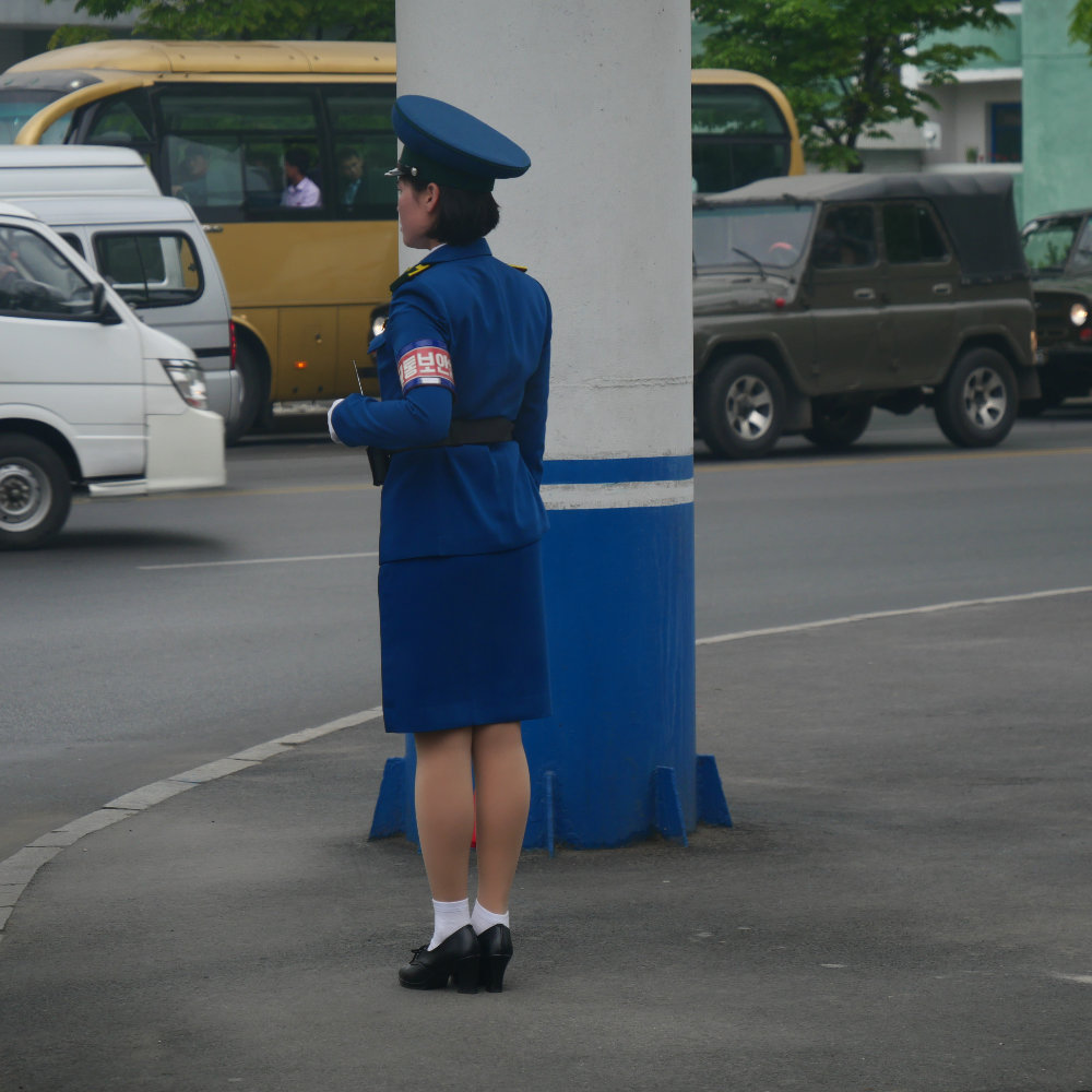 Zurück in Pyongyang erleben wir es dann aber doch noch. Einen Verkehrsstau zur Rush hour! Erstaunlich ist allerdings, dass zwei von drei Spuren unbenutzt bleiben und auch hier vor allem Buse und Lastwagen im Stau stecken. Vielleicht ist einfach die Verkehrsregelung nicht allzu effizient, so fällt mir diese Verkehrspolizistin auf, die am Rande einer Kreuzung steht – und gleichwohl den Verkehr zu regeln scheint. Irgendwie absurd wie das ganze Land.
