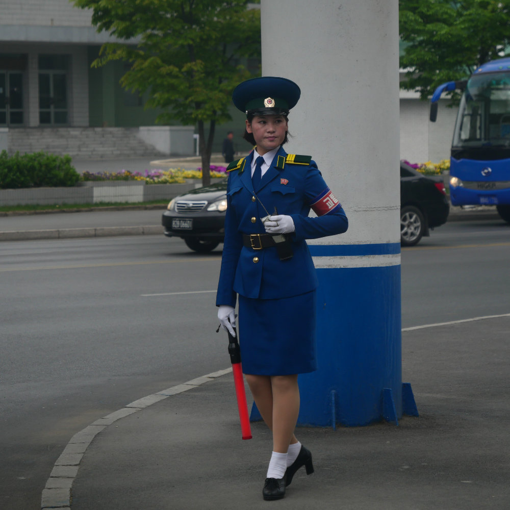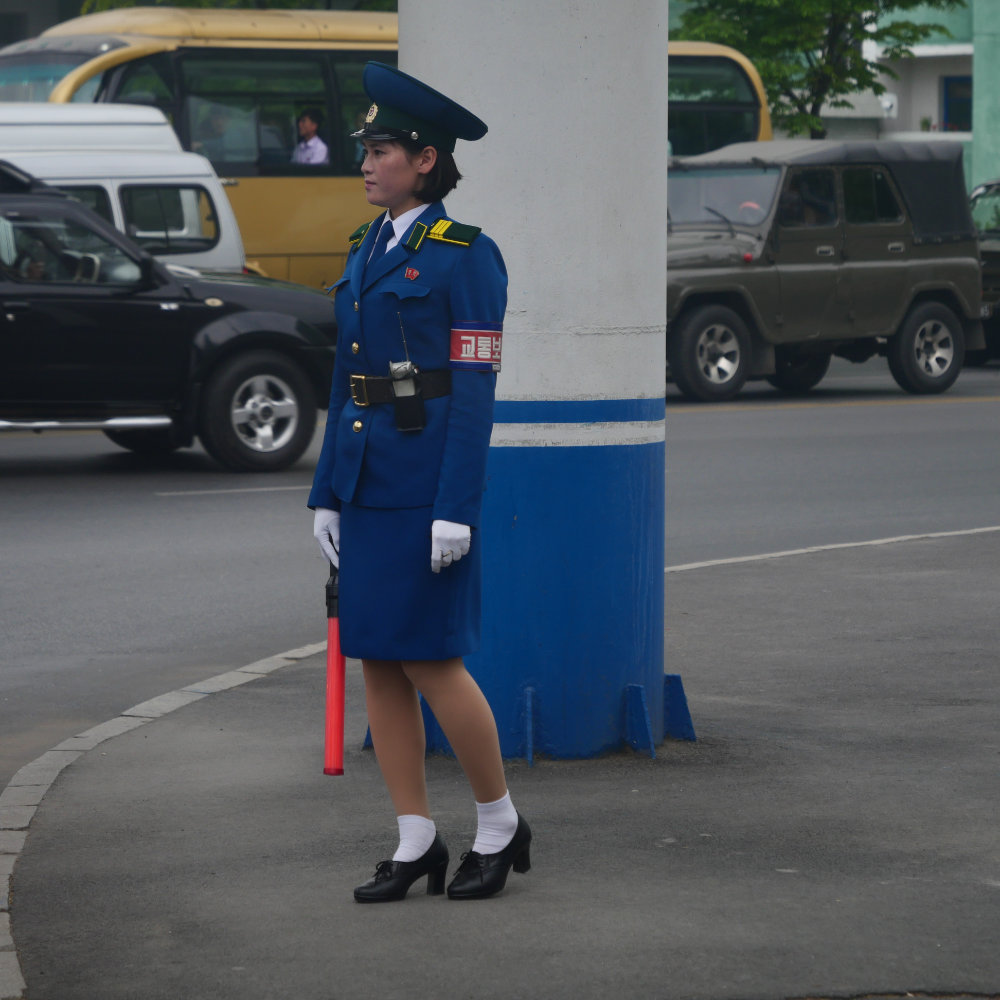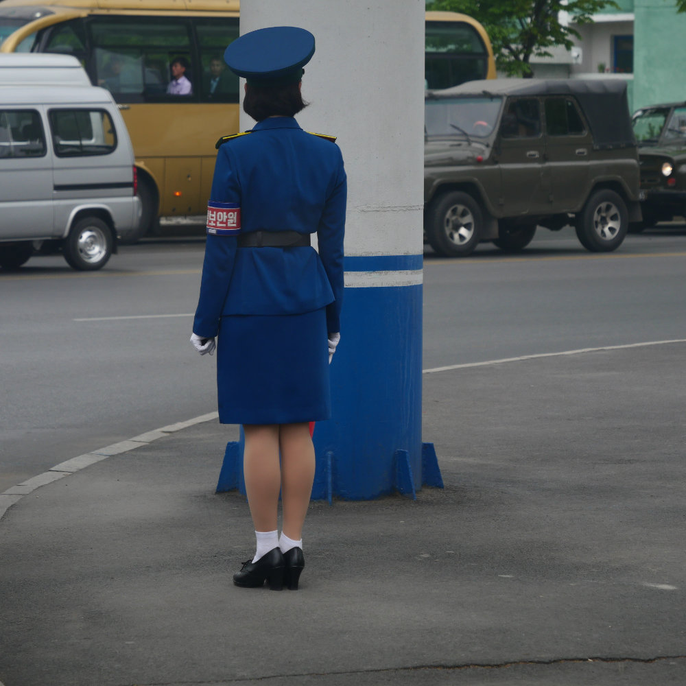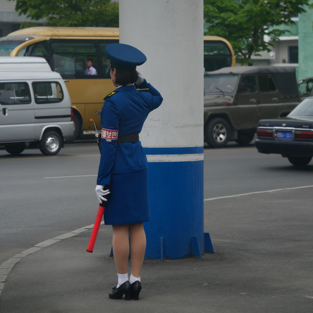Zurück in Pyongyang erleben wir es dann aber doch noch. Einen Verkehrsstau zur Rush hour! Erstaunlich ist allerdings, dass zwei von drei Spuren unbenutzt bleiben und auch hier vor allem Buse und Lastwagen im Stau stecken. Vielleicht ist einfach die Verkehrsregelung nicht allzu effizient, so fällt mir diese Verkehrspolizistin auf, die am Rande einer Kreuzung steht – und gleichwohl den Verkehr zu regeln scheint. Irgendwie absurd wie das ganze Land.