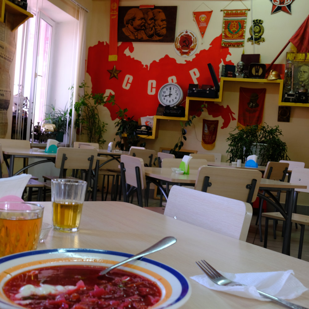 Wir fahren zum Bahnhof von Bender. Ein Gebäude aus Sowjetzeiten, das viele Relikte aus vergangener Zeit beherbergt. Im ersten Stock gibt es ein „sowjetisches“ Restaurant, wo wir einem alten Bekannten begegnen: Lenin. Wir essen Borschtsch, um uns noch etwas zu kräftigen, bevor wir uns zum Höhepunkt des heutigen Tages begeben werden.