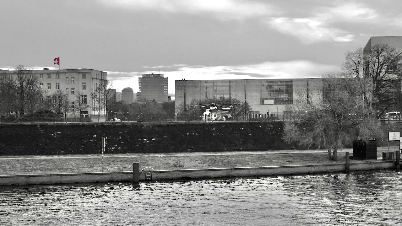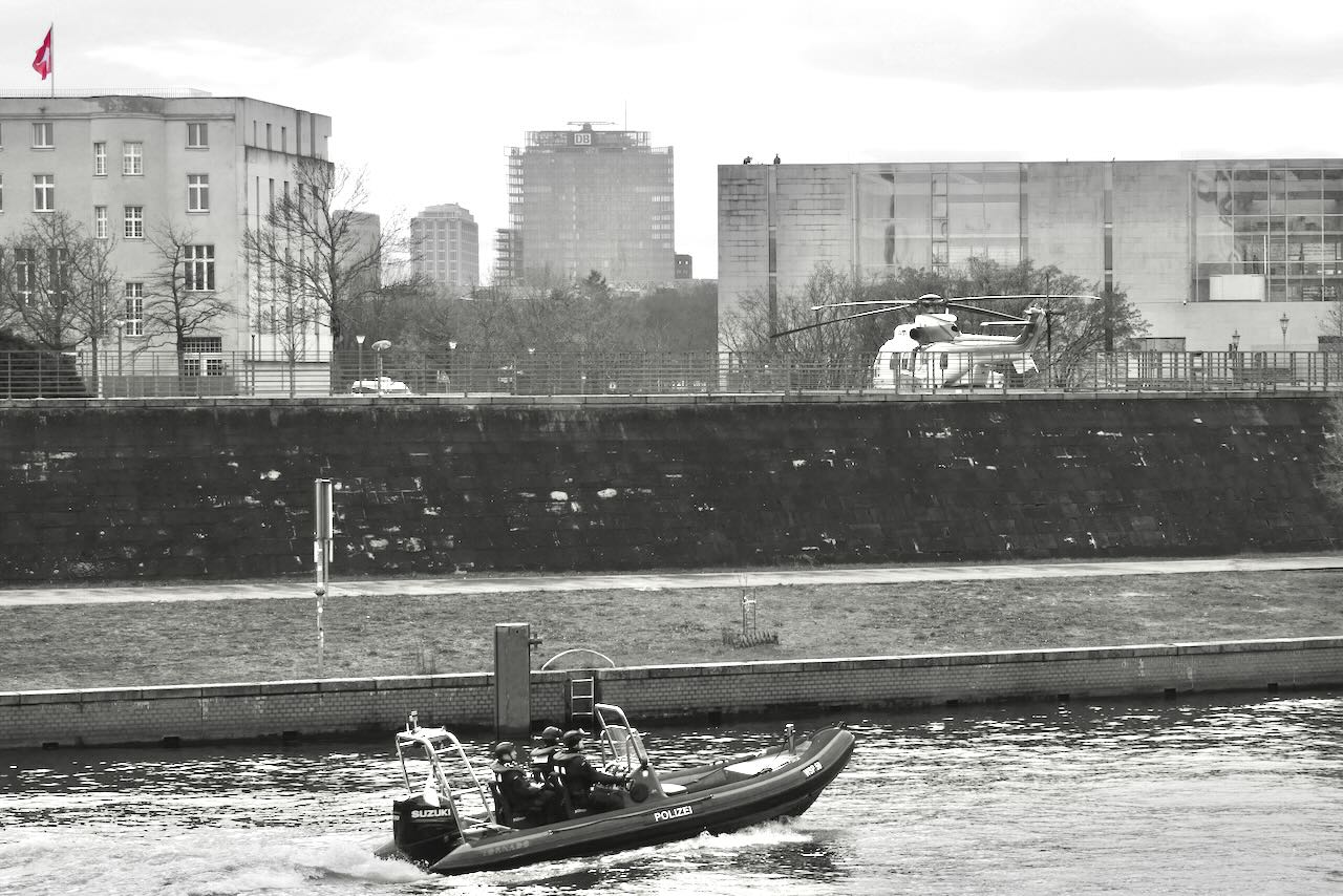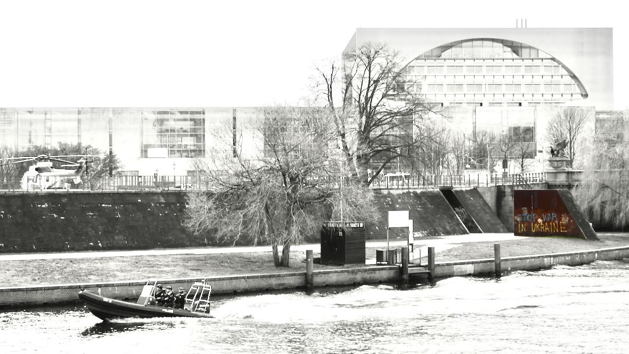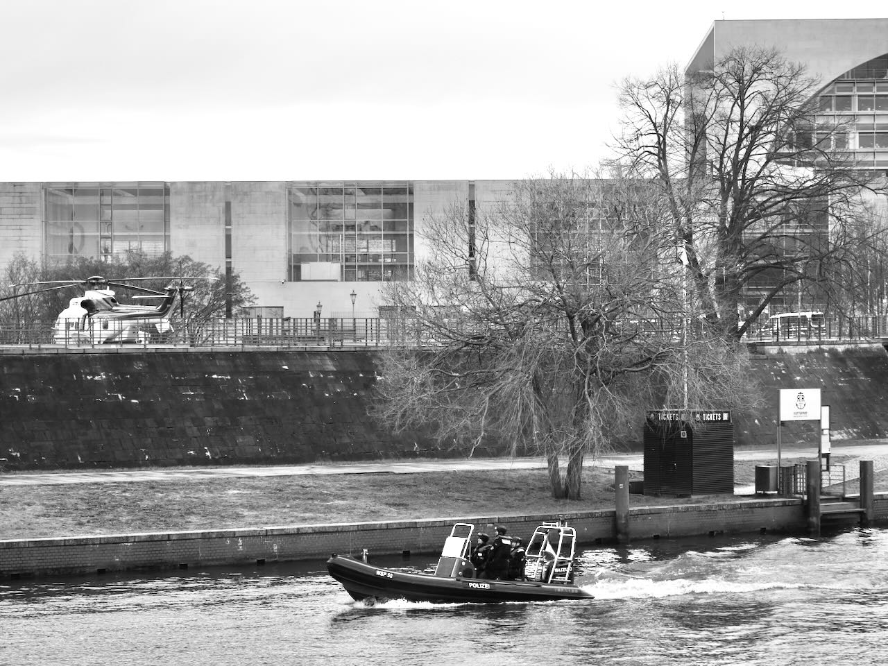 Ein Helikopter nähert sich mit grossem Getöse, landet direkt vor dem Bundeskanzleramt. Es wirkt nicht so, als ob Selenski da drinnen gesessen hätte, aber natürlich ist alles unübersichtlich. Wenig später fahren plötzlich verschiedene Polizeivans auf eine Brücke und halten. Einige andere fahren vorbei. Ein Helikopter kreist über einem anderen Gebäude, plötzlich sind Scharfschützen auf den Dächern zu entdecken. Dann dreht der Helikopter ab und es entspannt sich die Lage. Irgendwann realisiere ich, dass die Passage entlang der Spree wieder geöffnet ist. Alltag ist noch nicht eingekehrt, aber das Sicherheitsdispositiv hat bis dahin funktioniert. Gott sei Dank.