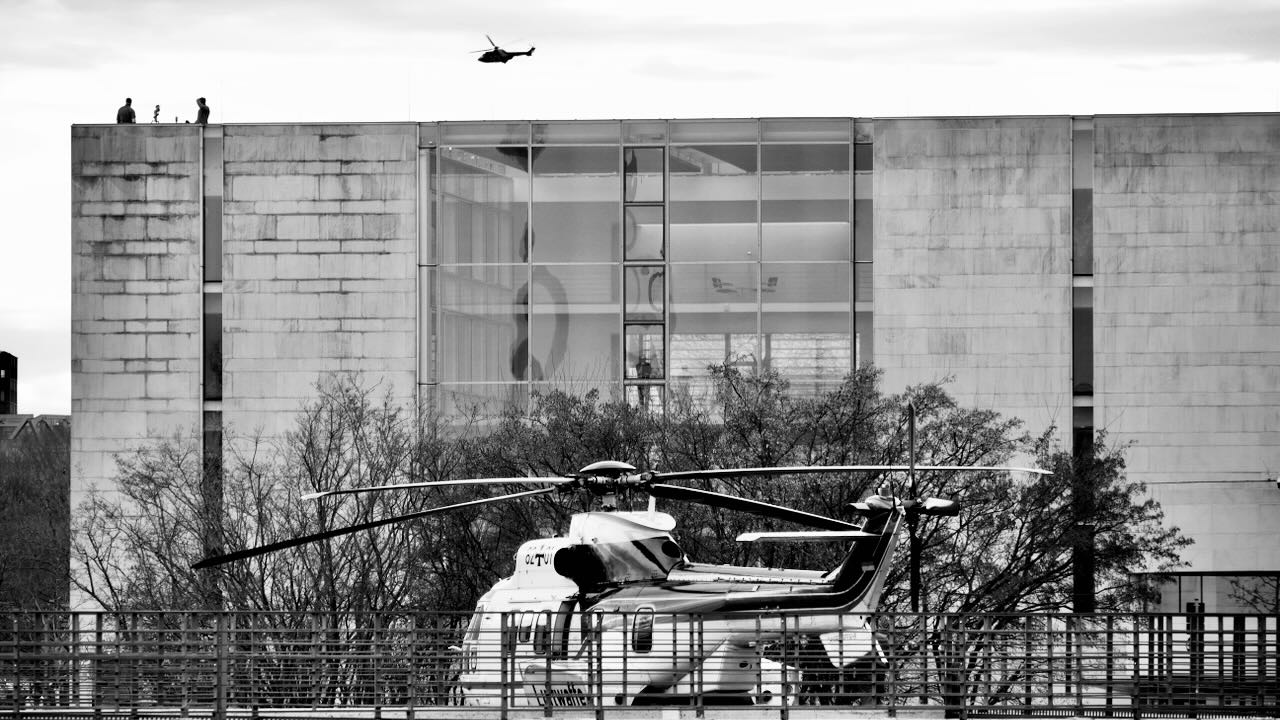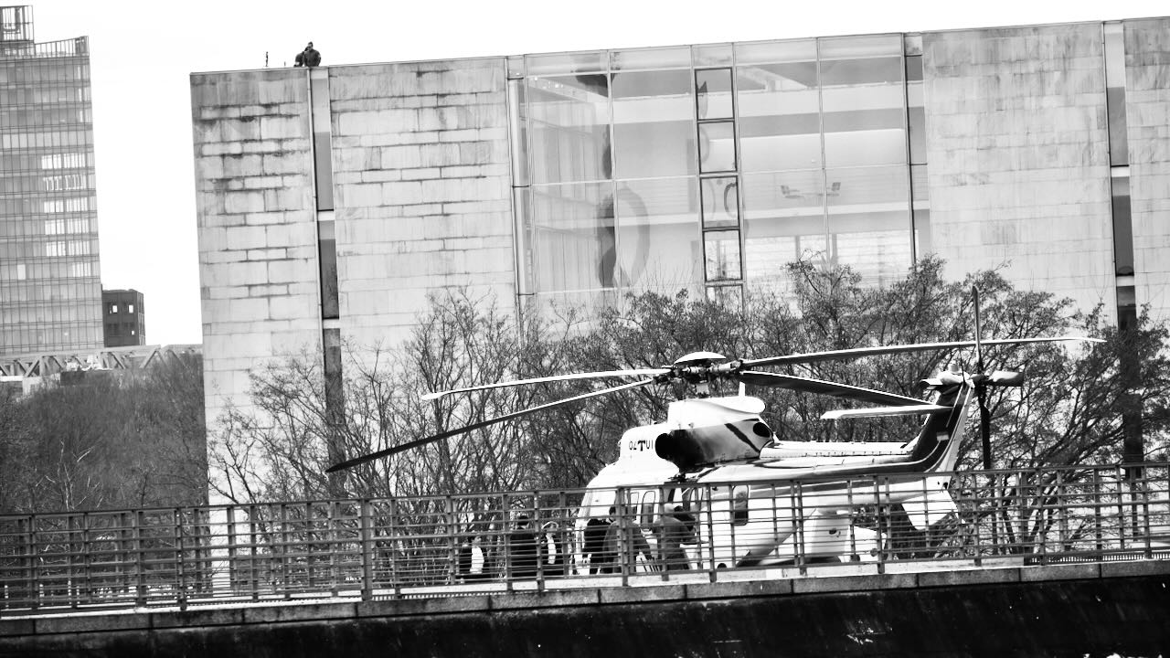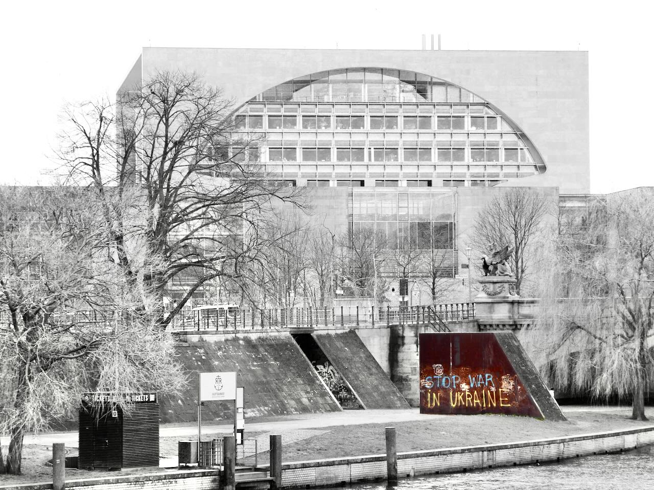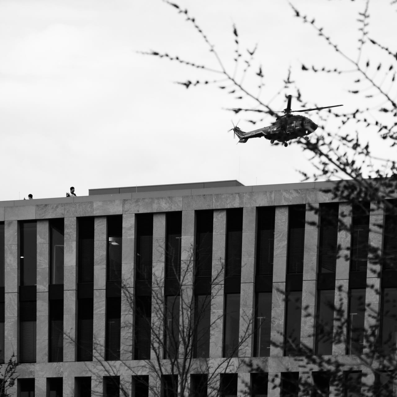 Ein Helikopter nähert sich mit grossem Getöse, landet direkt vor dem Bundeskanzleramt. Es wirkt nicht so, als ob Selenski da drinnen gesessen hätte, aber natürlich ist alles unübersichtlich. Wenig später fahren plötzlich verschiedene Polizeivans auf eine Brücke und halten. Einige andere fahren vorbei. Ein Helikopter kreist über einem anderen Gebäude, plötzlich sind Scharfschützen auf den Dächern zu entdecken. Dann dreht der Helikopter ab und es entspannt sich die Lage. Irgendwann realisiere ich, dass die Passage entlang der Spree wieder geöffnet ist. Alltag ist noch nicht eingekehrt, aber das Sicherheitsdispositiv hat bis dahin funktioniert. Gott sei Dank.