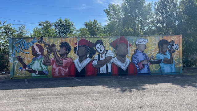 Im Stadtzentrum sind ebenfalls viele Häuser zerfallen, viele Geschäfte verwaist, eine Kirche in sich zusammengefallen. Man kann sich kaum vorstellen, dass das das Zentrum einer Stadt ist, die einmal fast so gross wie Genf gewesen ist. Und doch gibt es auch wenige positive Zeichen. Zum Beispiele eine Kunstschule, Kunst im öffentlichen Raum.