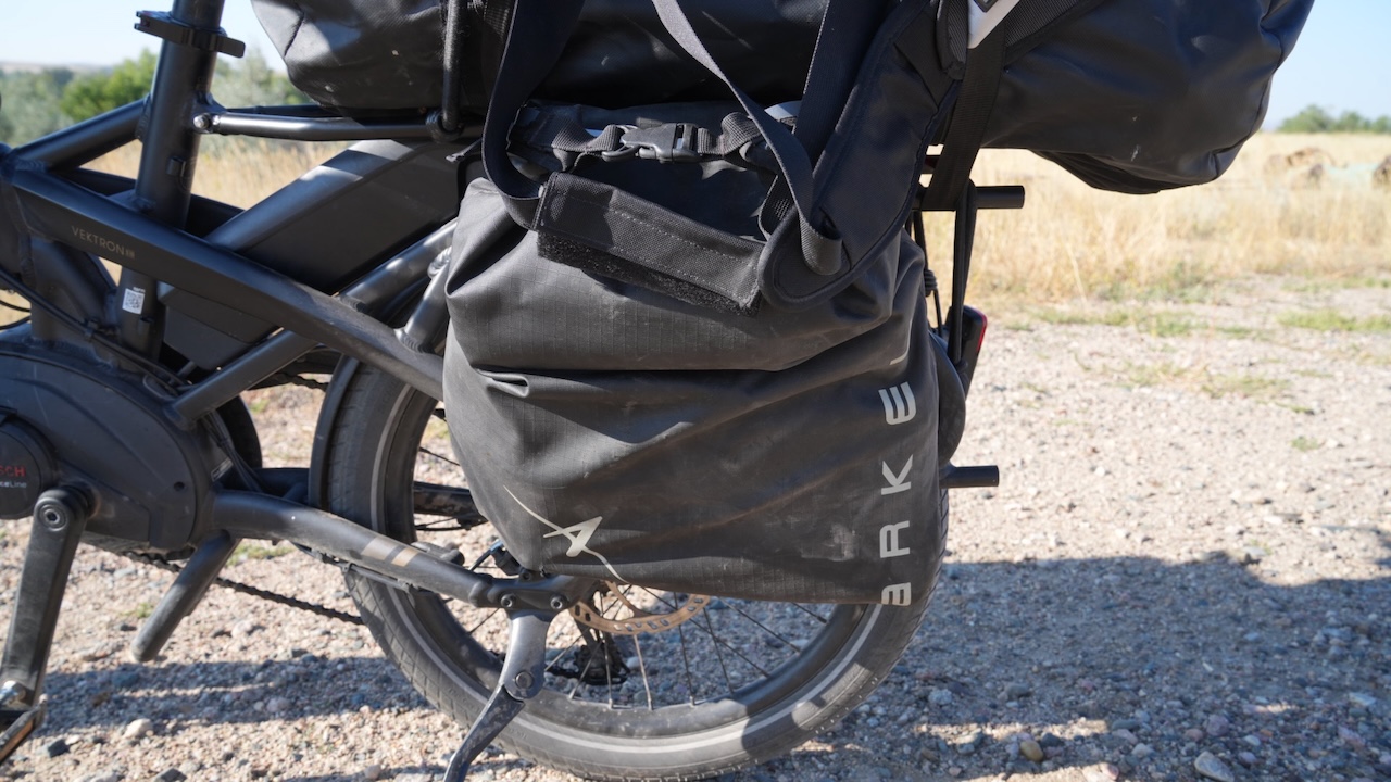 Mein Gepäck besteht grundsätzlich aus einer 70 Liter Tasche und einer Bromptontasche, die ich via einen selbst gebauten Adapter über dem Vorderrad befestigen kann. Geht nicht mit einem „erwachsenen“ Rad. Die Räder benötigen zu viel Platz. Ich habe aber noch zwei kleine Seitentaschen auf dem Gepäckträger, die ich auch mit der grossen Tasche auf dem Gepäckträger noch öffnen kann. Und die auch im gefalteten Zustand am Velo bleiben können. Links die zwei Ersatzakkus (die auch in der Tasche Platz finden), was sehr praktisch ist, da ich diese ja (fast) jeden Tag verwende und so nicht jedes Mal die Tasche öffnen muss. Zudem je nach Länge der Strecke noch etwas Wasser. Auf der rechten Seite befinden sich Esswaren und Wasser. Auch spontane Einkäufe (meist Esswaren) finden in den beiden Taschen meist Platz.