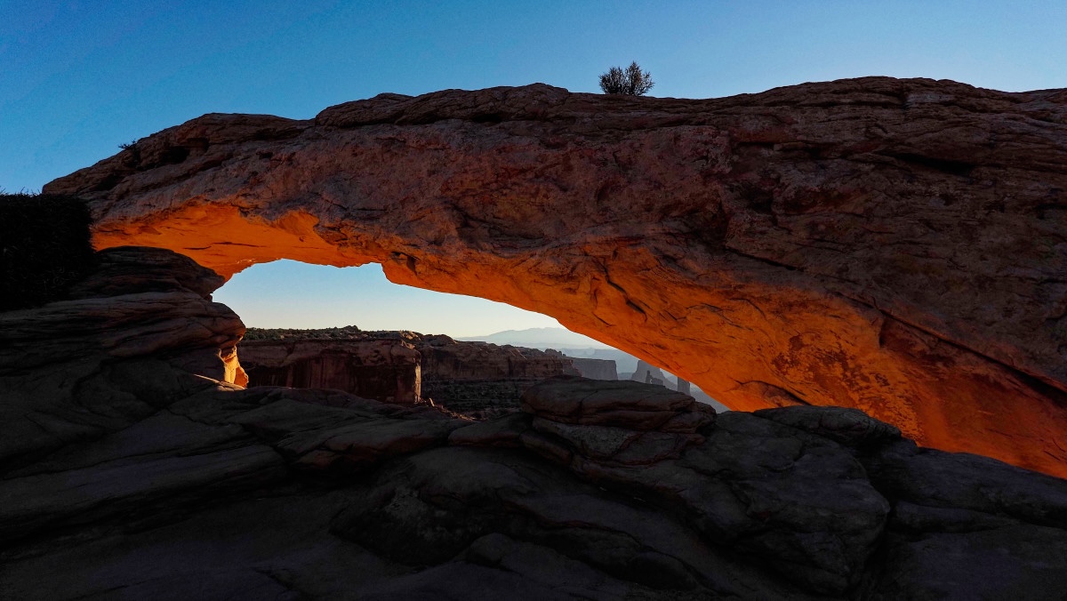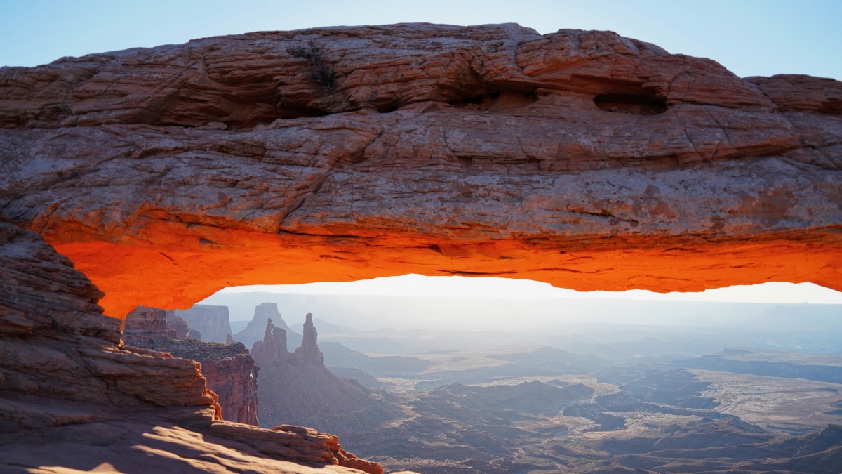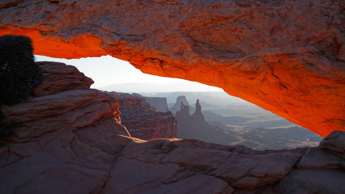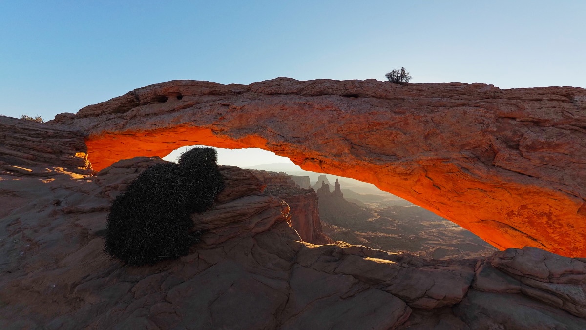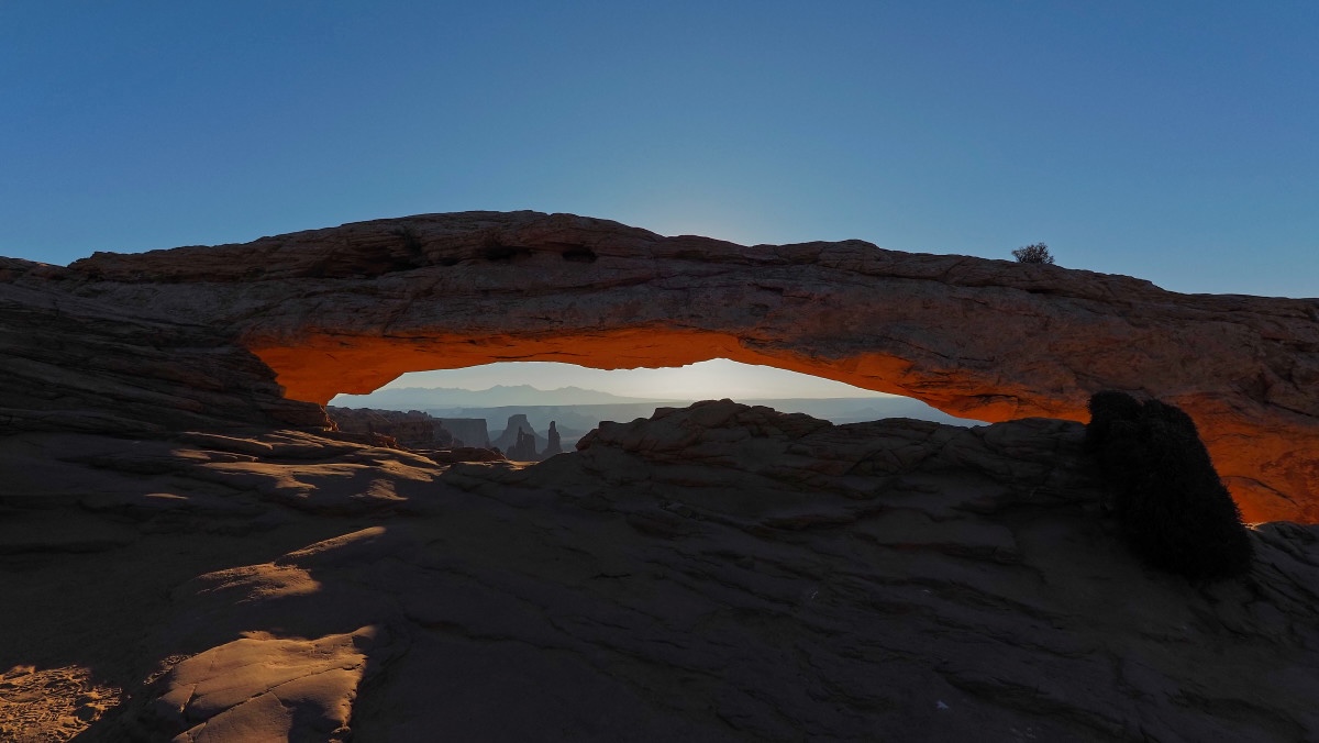 Weil es doch recht kühl ist (18 Grad gemäss meinem Thermometer, das wohl meine Reyse nicht weiter begleiten wird) mag ich nicht so richtig aufstehen. Bis die Sonne kommt. Etwas nach Sieben mache ich mich dann aber auf und es ist draussen überraschenderweise schon recht warm. Ich fahre zum Mesa Arch, von dem bro ebenfalls geschwärmt hat. Lustig. Er nutzt Google, ich nicht. Ich gehe gleich direkt hin ohne genau zu wissen, was mich erwartet. Auf dem Weg (es sind nur ein paar Minuten) begegnen mir viele Autos. Der Park öffnet aber doch erst um 8? Und Campingplätze hat es genau einen? Beim Trailhead angekommen stehen vielleicht zwei Dutzend Autos da. Ich gehe die paar hundert Meter zu Fuss zum Mesa Arch und mir kommt eine Völkerwanderung entgegen. Ein Mann spricht mich im Vorbeigehen an: „you are smart“. Ich entgegne: „I am too late“. Offensichtlich habe ich den Sonnenaufgang verpasst. Aber: Glück.