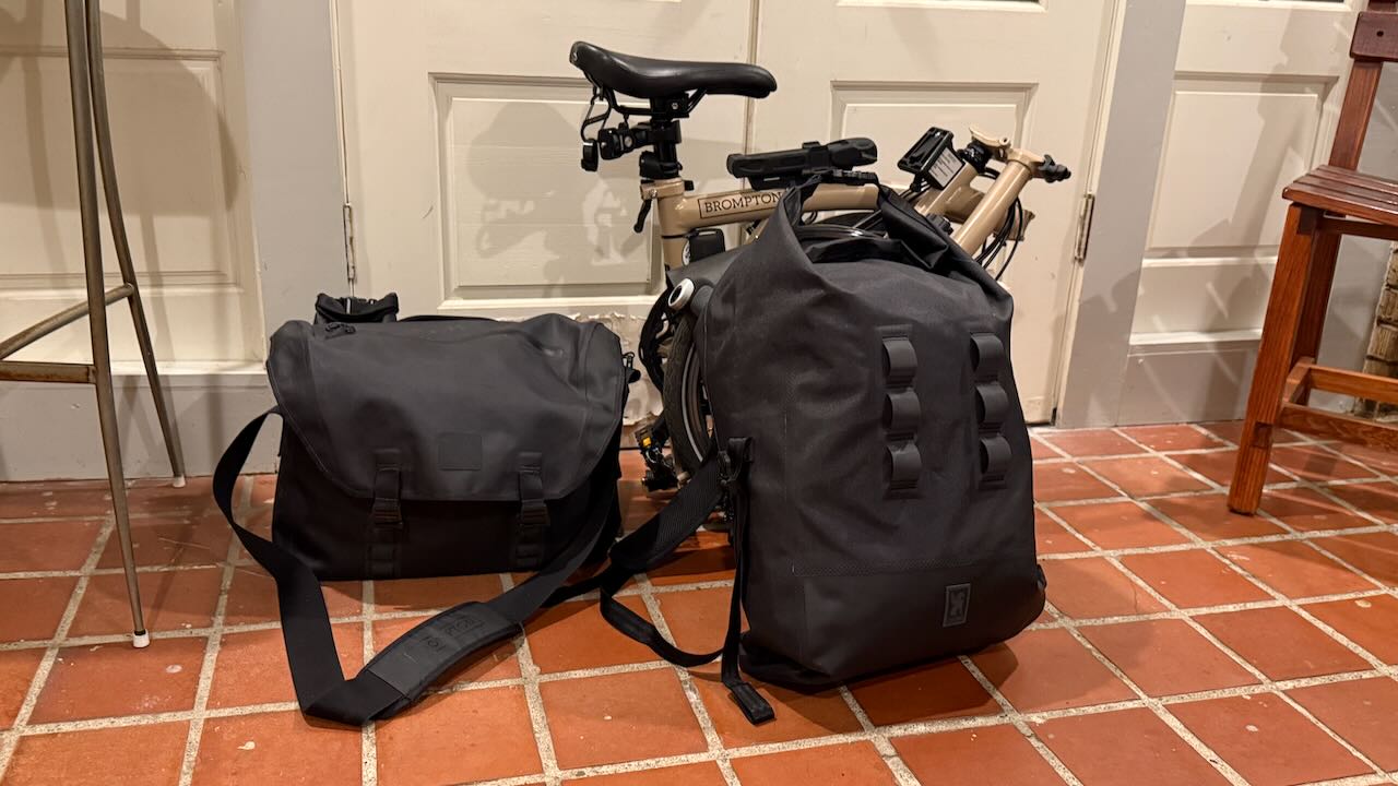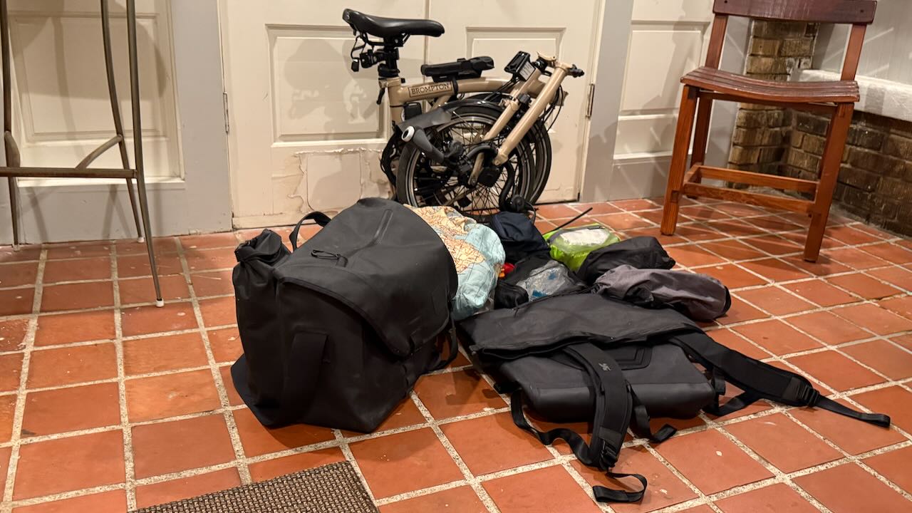 Zweitaschensetup: Brompton inklusive neuem Rucksack inklusive Inhalt in der Ikeatasche, plus Vordere Tasche. That’s it. OK. Der Helm muss wohl aussen an die Vordertasche dran…