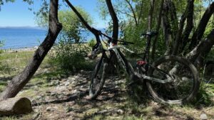 Trailbiken ist sowas von geil! Macht unfassbar Spass! Nachdem ich gestern erst lange einer Hauptstrasse entlang gefahren bin – meist auf dem Gravelstandstreifen – und ab und zu schöne Strände entdecken durfte, komme ich an einen Fluss. Gemäss meiner App hat es dem Fluss entlang Wege bis zum See. Ist aber relativ weit. Ich schaue mal wie weit ich komme. Und bin bald hell begeistert. Eine Unzahl von kleinen, zum Teil halb zugewachsenen Wegen durchziehen die Ebene. Mal muss ich umkehren, mal durch einen kleinen Bach durchwaten, mal sind Wurzeln im Weg – mit dem gemieteten Bike macht es einfach Spass. Irgendwann gibt es dann kaum noch Wege und ich fahre im ausgetrockneten Flussbett, auch hier wäre das ohne „Fully-Velo“ kaum möglich. Irgendwann erreiche ich den Strand, wo es stark windet, was von Surfern genutzt wird. Ja, es hat auch eine reguläre Strasse hierher. Aber das spielt keine Rolle.